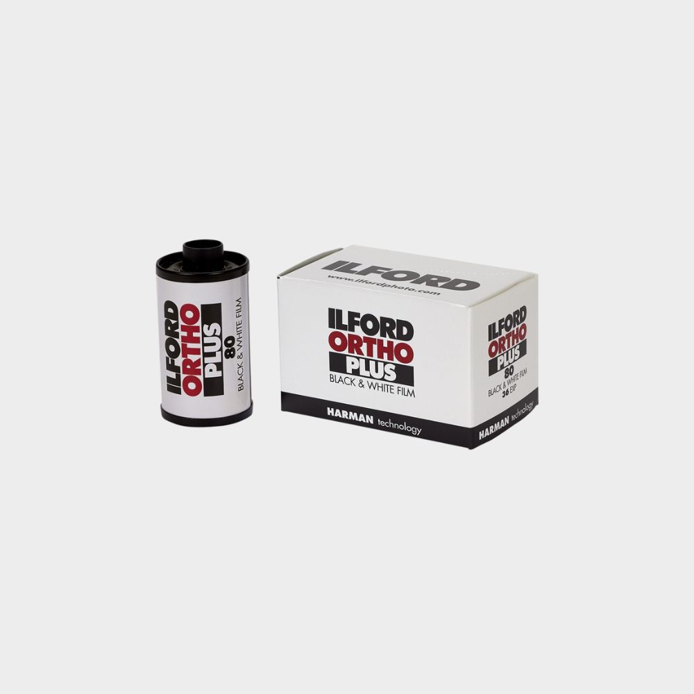 Ilford ORTHO PLUS to czarno-biały film 35 mm z 36 klatkami i czułością ISO 80 przy świetle dziennym. To emulsja ortochromatyczna, czyli reagująca głównie na niebieski i zielony, pomijając czerwień. Dzięki temu zdjęcia zyskują nietypowy kontrast i klimat, którego nie daje większość współczesnych filmów.